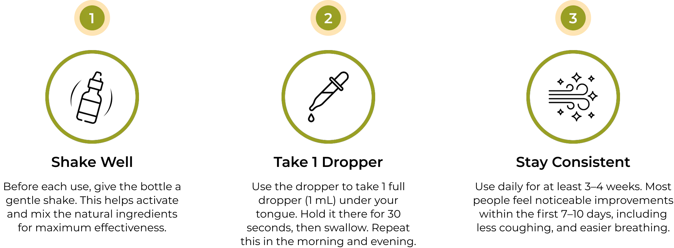 A: Most users feel a loosening in their chest within 3-4 days. You should experience noticeable improvements, including less coughing and easier breathing, within 7-10 days. We recommend consistent use for 3-4 weeks to complete the initial "clearing" cycle.